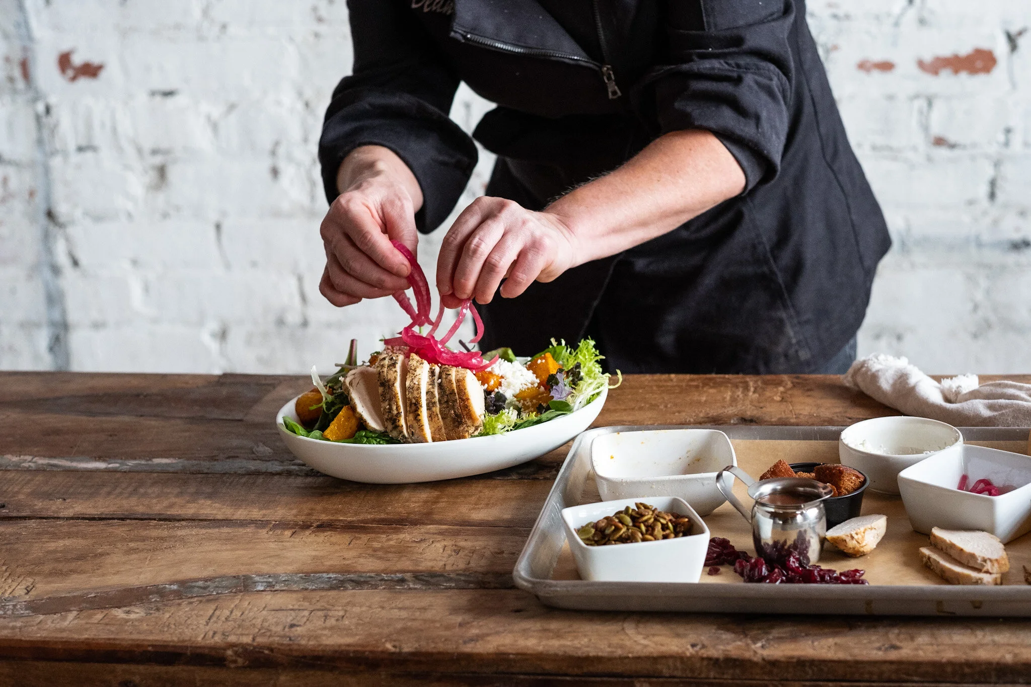 Chef garnishes the Autumn Chicken Salad
